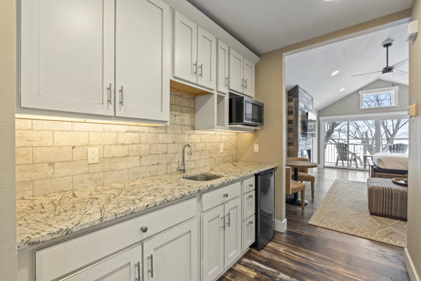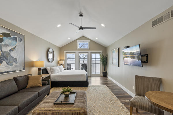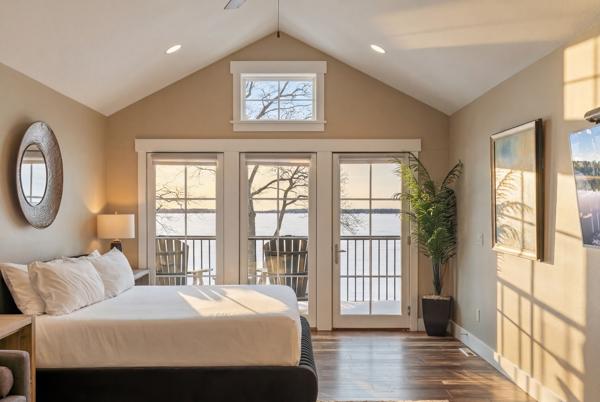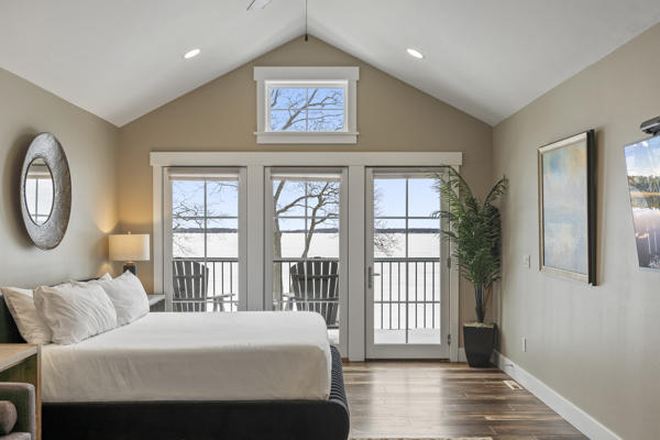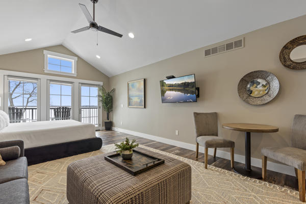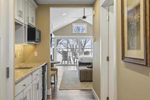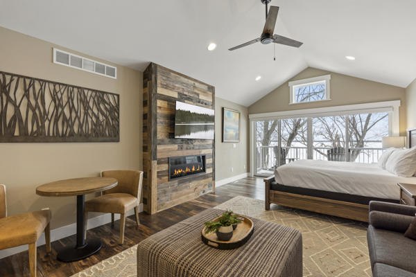 This upper level lakeside studio condo retreat has beautiful views of Gull Lake and can sleep up to 2 people. This unit features a private entrance with stairs, 1 queen bed, a balcony, Wi-Fi, AC/Heat, flat screen tv, bathroom with shower and kitchenette with a small refrigerator, toaster, coffee maker, microwave, sink counter and basic dishes.
